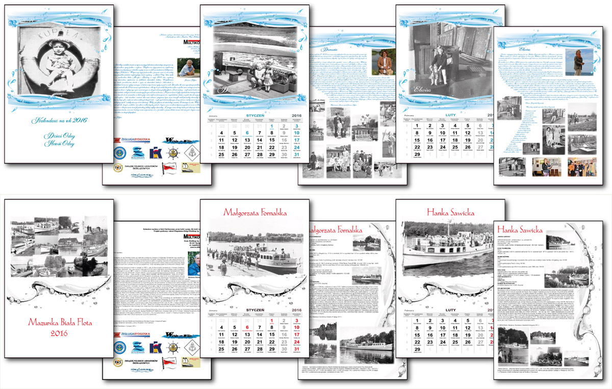 15 grudnia 2015 r. oddamy do Państwa rąk kolejne kalendarze wodniackie na rok 2016. Jak w roku ubiegłym autorami są Janusz Fąfara i Waldemar Danielewicz. „Dzieci Odry, Herosi Odry” Janusza Fąfary nawiązuje do wystawy „Dzieci Odry”, która miała miejsce we Wrocławskim klubie Muzyki i Literatury w 2013 r. poświęconej dzieciństwu spędzonemu na pokładach odrzańskich statków. Waldemar Danielewicz w kalendarzu „Mazurska Biała Flota” przedstawia statki mazurskiej floty pasażerskiej. Po niektórych pozostały - niestety - jedynie fotografie i wspomnienia, ale część nadal przemierza mazurskie jeziora i kanały, pozwalając poznać turystom piękno i bogactwo mazurskich krajobrazów.